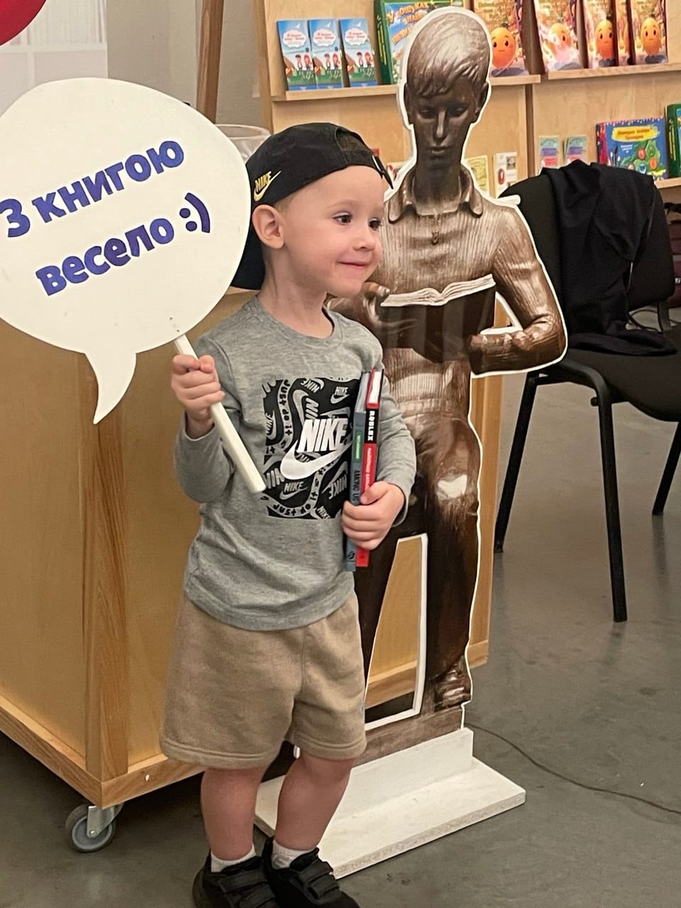 Допомагав бібліотекарям наш Хлопчик, що читає книжку – айстопер – копія скульптури, розташованої біля входу в бібліотеку. Відвідувачі залюбки робили класні світлини з хмарками думок біля Хлопчика.