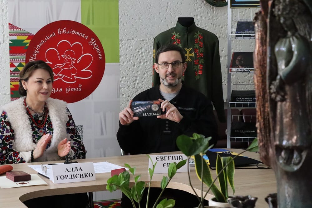 Полковник Євгеній Єрін, звертаючись до присутніх, зазначив, що залучення ГУР до участі та реалізації бібліотечних ініціатив – це надзвичайно відповідальна і почесна місія. Дитяча творчість і молитва надзвичайно мотивують на боротьбу і перемогу. За дорученням керівництва ГУР, пан Євгеній передав для бібліотеки надцінні подарунки й символічні артефакти: книжку про розвідувальну діяльність, монету в сувенірному пакуванні, прапор, колекційний вимпел-стяг, власний віршотвір…