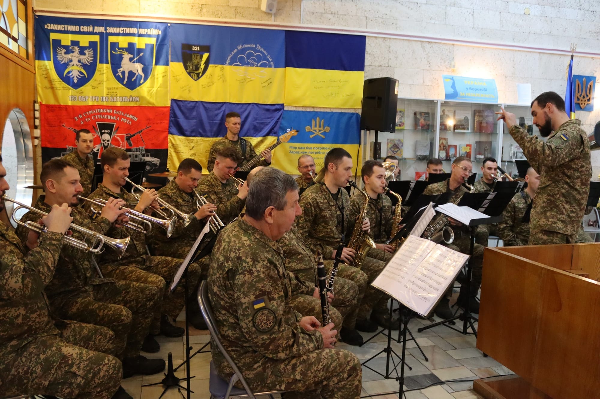 Різдво в Україні неможливе без музики. Святковий концерт відвідувачам бібліотеки подарував оркестр військової частини 3030 25-ї бригади охорони громадського порядку ім. Князя Аскольда Національної гвардії України. Диригент – Василій Канчій.