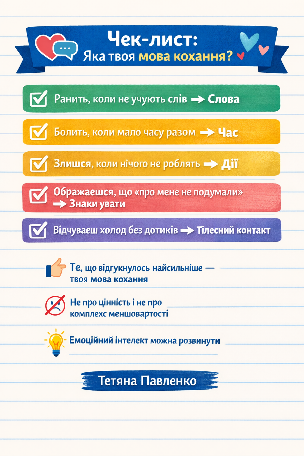 Щоб зрозуміти, яка мова кохання у вас і вашого партнера, я підготувала невеличний чек-лист: