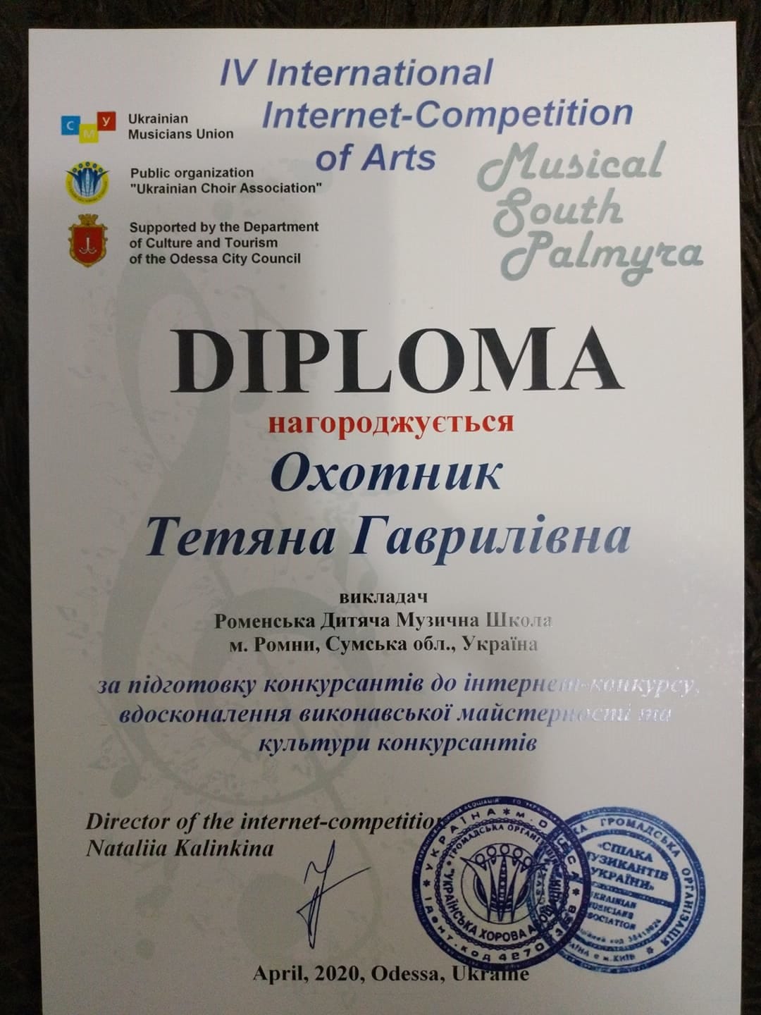 Незважаючи на пандемію лише в цьому році Ромни отримали чимало вагомих нагород, що коронують учнів місцевого музичного закладу та прославляють діяльність його педагогів, серед яких вчитель вищої категорії Тетяна Гаврилівна Охотник.